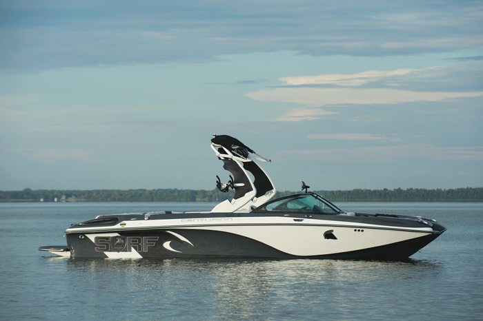 Centurion’s Enzo FS33 is the company’s best boat to date. Period. This boat is the culmination of every model to come before it in terms of performance, technology and style, and the result is an absolute surf monster. The lounge has flip-up seating that allows passengers to face backward to see the action without straining their necks, which is a great feature for long surf sets. The helm features two digital screens to separate and simplify all the boat’s functions. The system can store rider presets to call up everything you need to get a specific wave at a moment’s notice. The boat does all the work. For a solid port surf jumping-off point, try loading the FS33 with 100 percent port ballast, 20 to 40 percent starboard, and 100 percent bow. If you have the optional World Wakesurfing plug and play ballast, fill that to 100 percent on the side you want to surf. For starboard surfing, do equal amounts on the opposite side. From there you can tweak the Wing Plate and CATS to your liking. Whether you want a steep and short wave with a ton of power or a flatter wave with a massive pocket, the FS33 can deliver with a few simple adjustments of the underwater gear.
