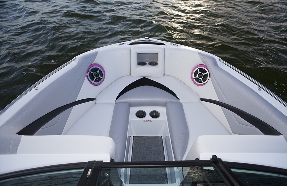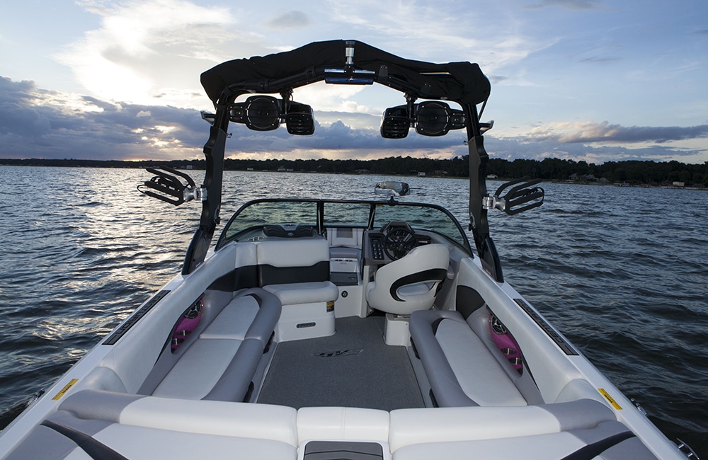 The SV244 also comes with a brand-new tower for 2015. It collapses easily, has LED lighting integrated right into the structure, space for four board racks, and multiple tower speakers. Zone audio is also new for Centurion this year, which is huge for dialing in separate audio levels and keeping everyone comfortable. We can’t talk about the SV244 without mentioning its bench seating. Any surf boat this good is going to attract a lot of people, and you can fit a lot of passengers really comfortably in the SV244 because of the uncluttered seating arrangement. It’s nothing fancy, but it’s ergonomic and it has a ton of space.