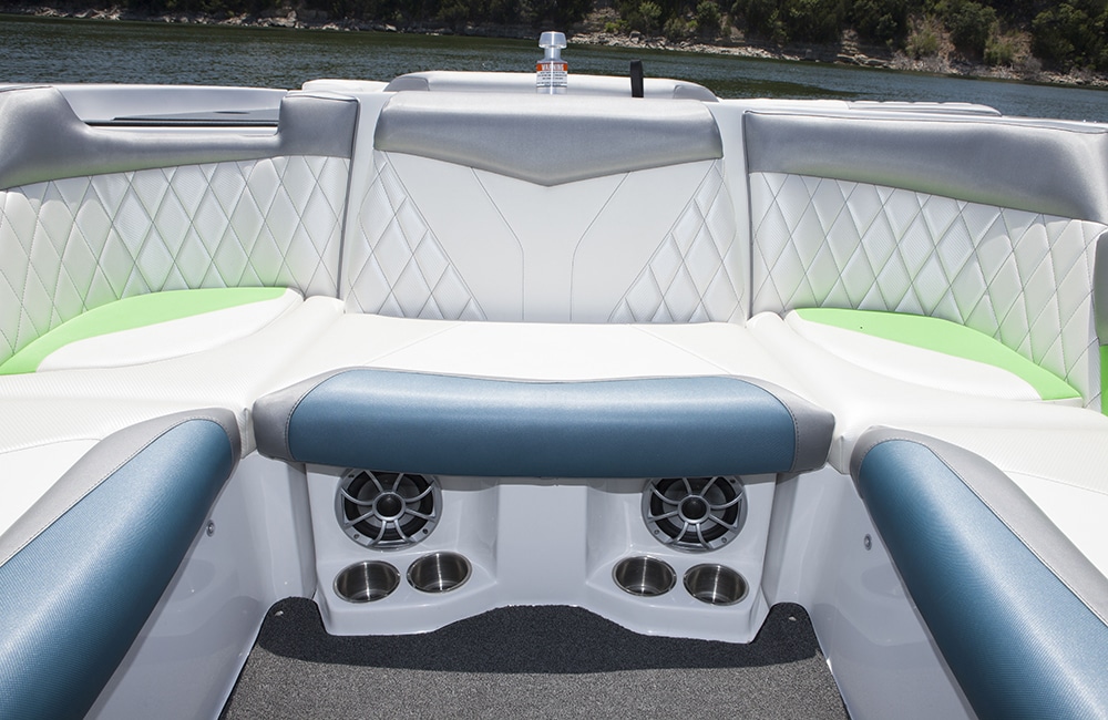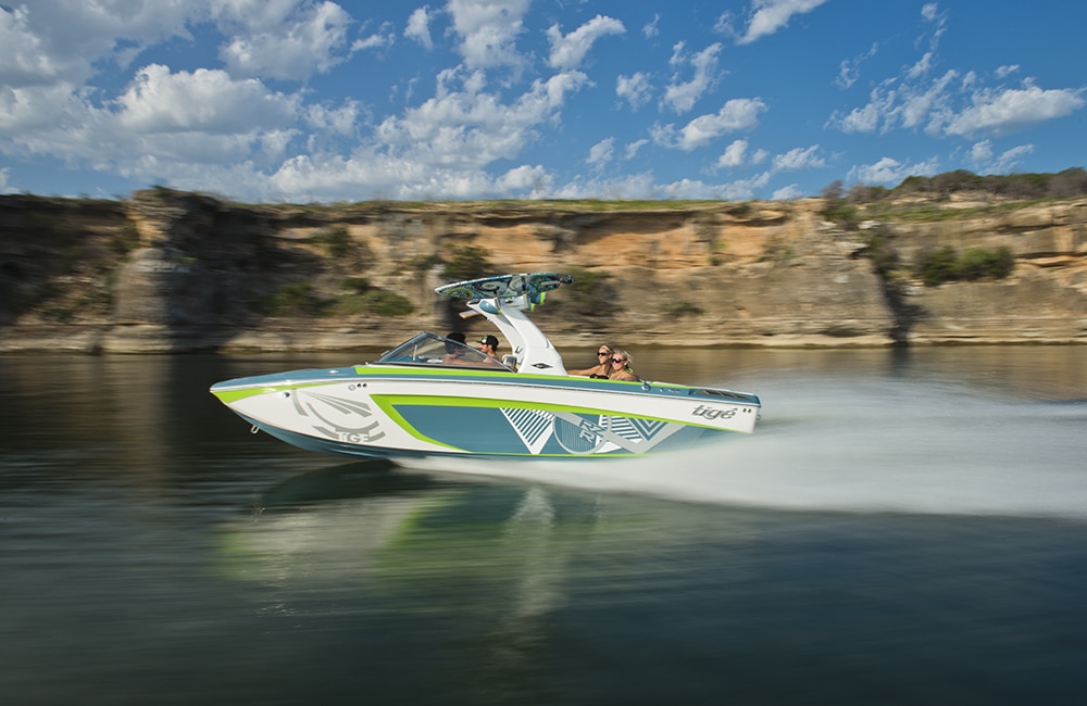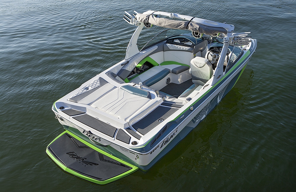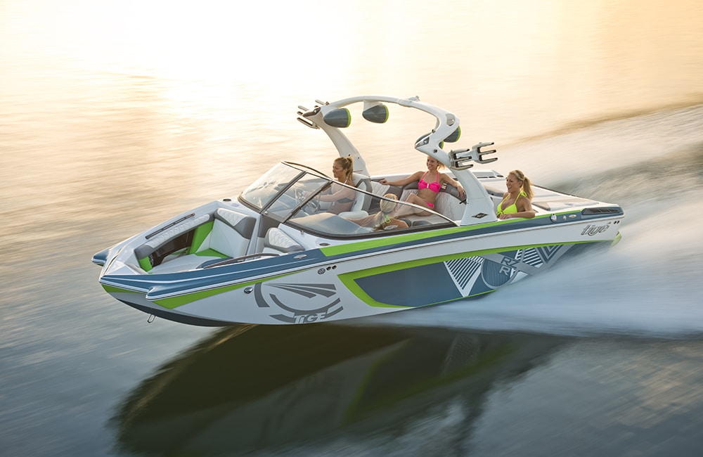 Tige‘s RZR is a versatile 20-footer with style in spades. The performance on this nimble little boat is above average for Wakeboarding, surfing, skiing and wakeskating. True to the brand, the RZR has classic Tige style. The RZR has been one of the best-looking interiors on the market for years. Textured vinyl with colors accents, softened lines and diamond stitching all add up to a great looking interior. Throw in the fiberglass floor with multiple pullout flooring options and you’ve got a low-maintenance head turner.