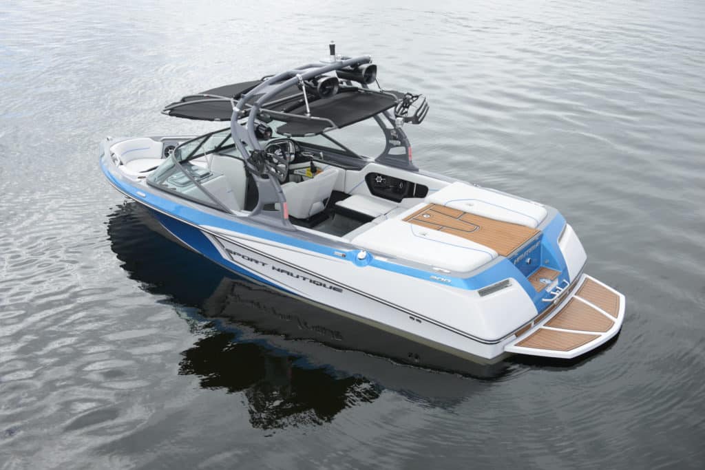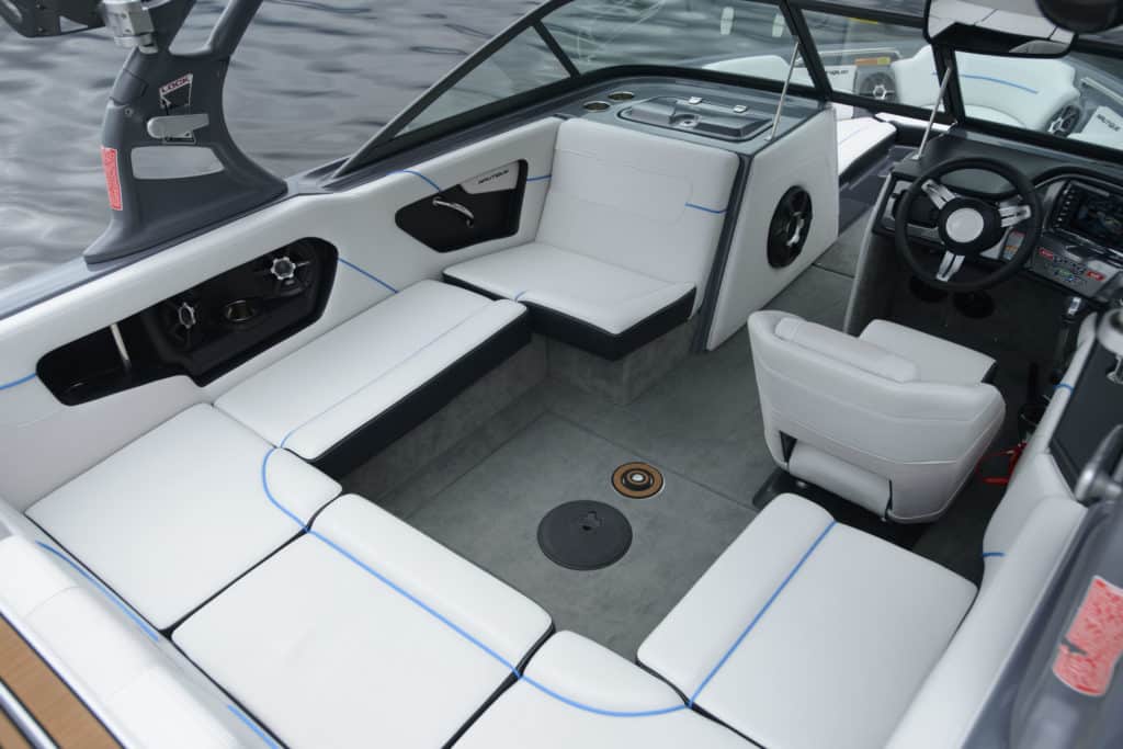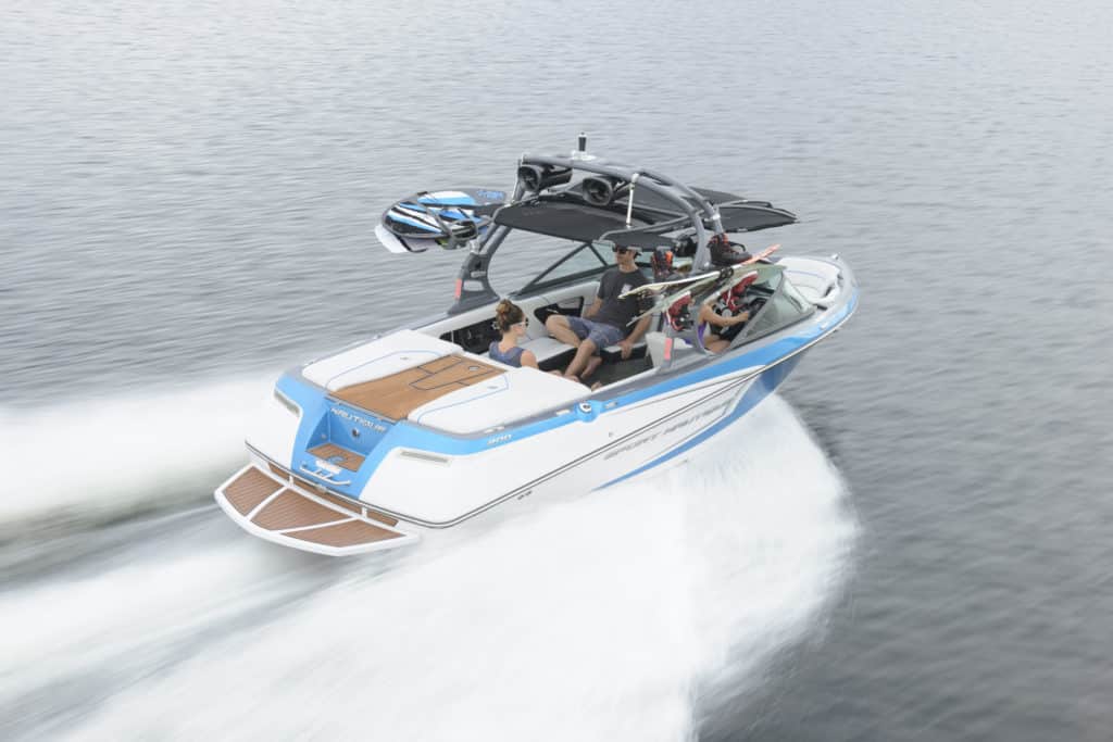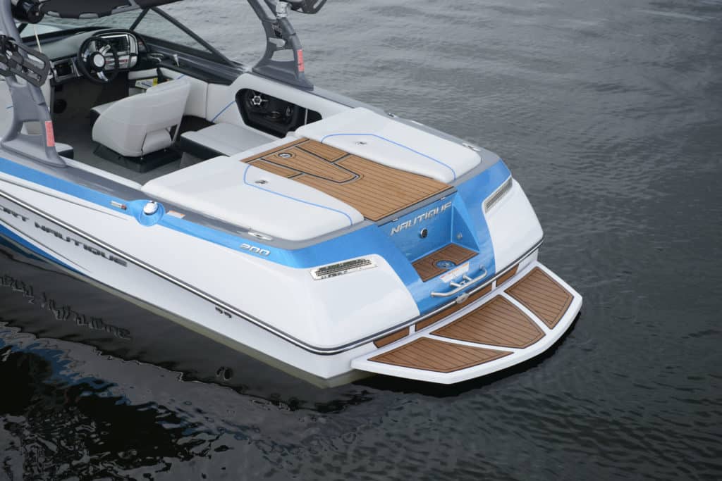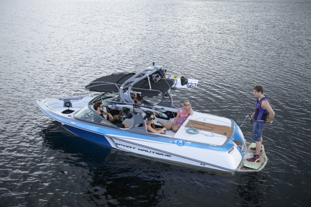 The Sport Nautique 200 is a great little all-around boat for multisport crews who want a nimble, easy to handle boat. At the helm, the LINC system does all the heavy lifting. It’s a digital screen with plenty of features to set this boat up without moving from the captain’s chair. Control the lighting, audio, wake shaping, ballast and more from one screen. This is really handy in a boat that will be used for multiple sports because you just set presets, hit the button and you’re ready to go. The interior-saving sun pad walk over is really handy. It’s extra wide and covered with marine grade foam so your interior will be safe from people walking back and forth from the water to the lounge. This is something you’ll appreciate down the line because Nautiques can really hold their value if they’re well cared for, and the interior is a big part of that. And finally, the Flight Control Tower. If you don’t think a tower is a big deal, try collapsing one that isn’t counter balanced. This tower is solid, it unlocks easily and it works perfectly with the look of the boat. All those things together make this tower one of the best on the market.