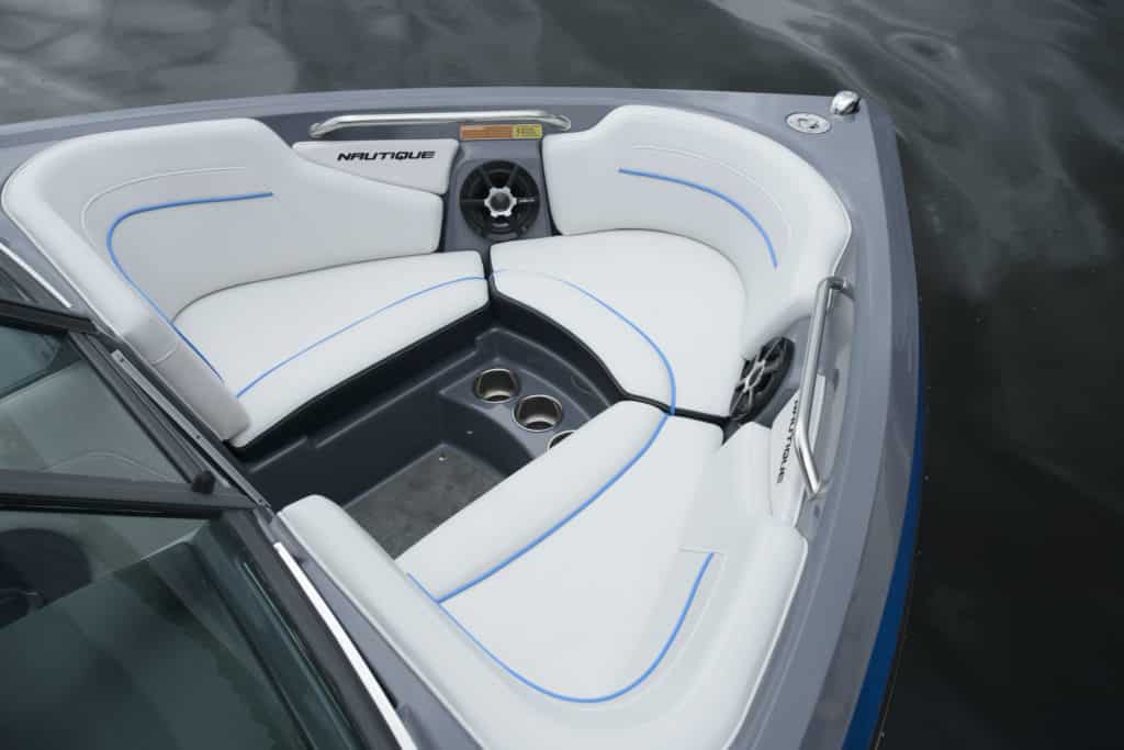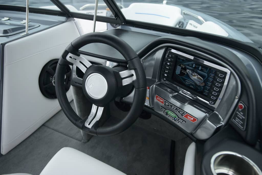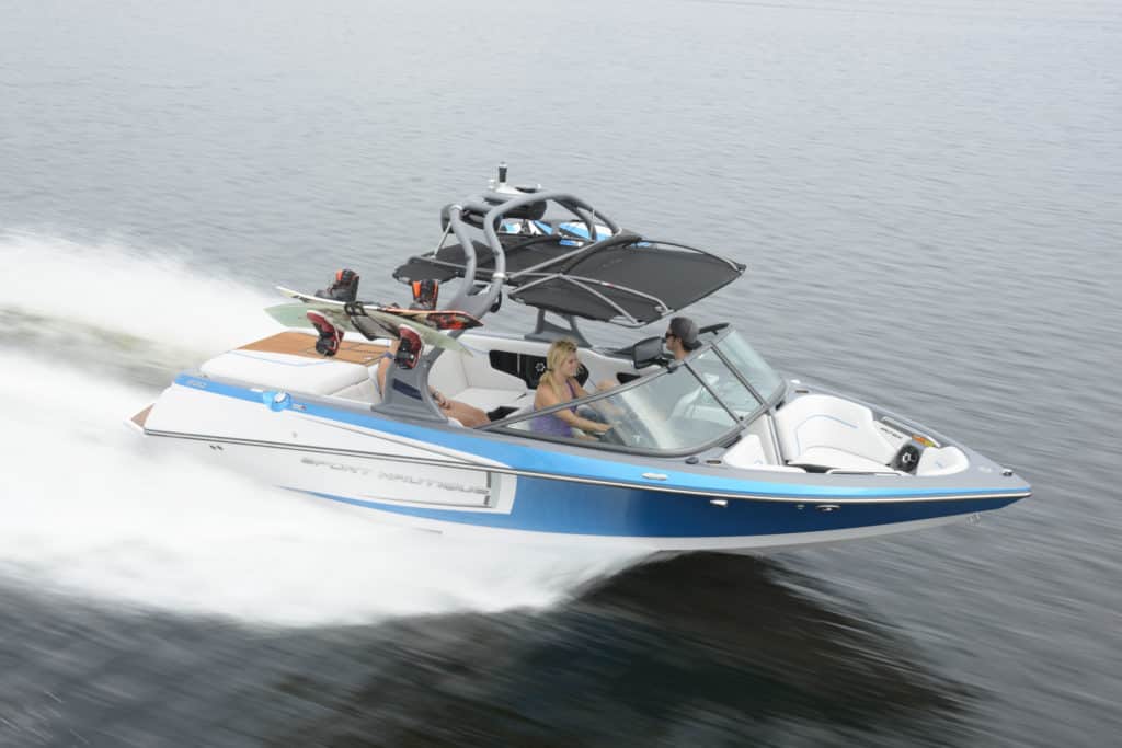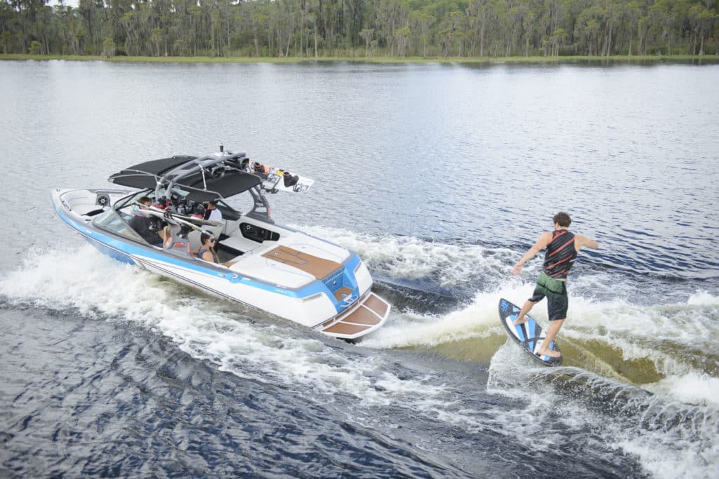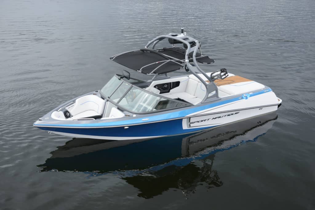 The Sport Nautique 200 is a great little all-around boat for multisport crews who want a nimble, easy to handle boat. At the helm, the LINC system does all the heavy lifting. It’s a digital screen with plenty of features to set this boat up without moving from the captain’s chair. Control the lighting, audio, wake shaping, ballast and more from one screen. This is really handy in a boat that will be used for multiple sports because you just set presets, hit the button and you’re ready to go. The interior-saving sun pad walk over is really handy. It’s extra wide and covered with marine grade foam so your interior will be safe from people walking back and forth from the water to the lounge. This is something you’ll appreciate down the line because Nautiques can really hold their value if they’re well cared for, and the interior is a big part of that. And finally, the Flight Control Tower. If you don’t think a tower is a big deal, try collapsing one that isn’t counter balanced. This tower is solid, it unlocks easily and it works perfectly with the look of the boat. All those things together make this tower one of the best on the market.