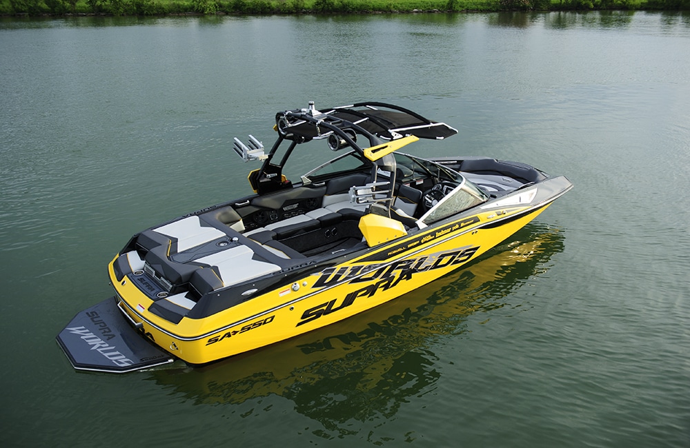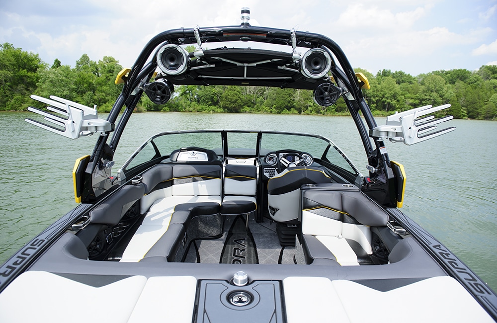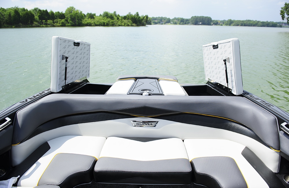 The sistership to the popular SC and the inspiration for the brand new SE, Supra’s SA is a sleek, high-performing wake boat with features abound. First, the new supra swell system. You no longer have to move weight from side to side to surf in a Supra. Just weight the boat evenly, pick which side you want to surf, what type of wave you want and you’re ready. It’s really simple and effective and it produces a great wave on the SA with the new increased standard ballast amounts for 2015. Next up is the helm. Supra’s power seat adjusts your captain’s chair height with a toggle switch, the Vision touch screen controls everything going on in the boat, and there’s analog backup on everything. The whole helm is really well thought out, just like the rest of the boat’s interior design. The bow is absolutely massive. There’s so much space there that it makes a whole separate social zone, and the lounge has ergonomic contours in a wraparound configuration that maximizes space.