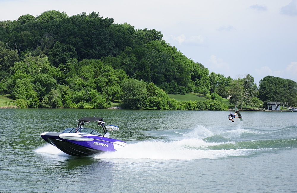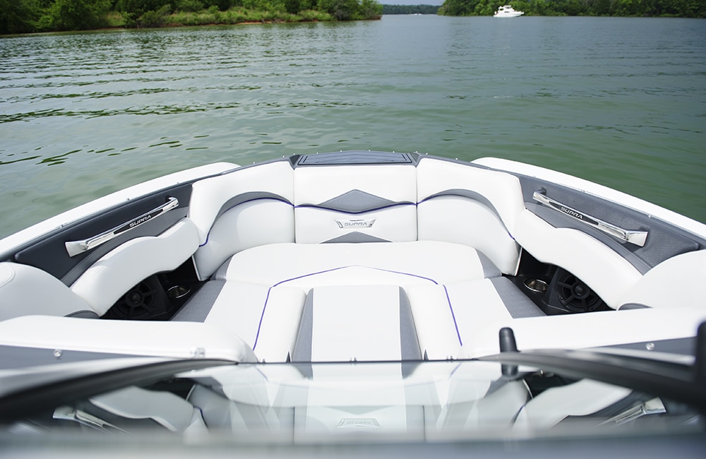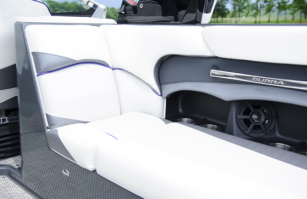 Supra’s all new SE is a massive 24.5 footer with way more features than we can mention here, but we’ll start with the new Supra Swell surf system. This is one of the most customizable surf systems out there. It has presets for a barrel or skim wave and from there, you can infinitely dial in the settings to get your ideal wave. The system allows you to switch from side to side without moving weight around. Another huge new feature is the new convertible bench seat. It flips up easily to reveal a bench with drink holders, then flips again for a rear-facing bench seat. It’s really well executed and gives passengers more seating options in a really convenient way. And finally, we can’t mention the SE without talking about its massive size. This is the biggest boat in the line. It’s massively deep so it can handle every bit of the 3,200 pounds that comes in the standard ballast and it still has plenty of storage. Want to really put it in perspective? The boat has 36 cup holders. Absolutely huge.