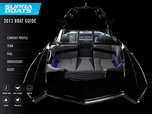 |## 2013 Supra Boat Guide| |Get more Supra with the 2013 Supra Boat Guide. Explore Supra’ 2013 wakeboard boats, meet the Supra Boats team, and see Supra’s latest innovations through video, full-screen photo galleries and more. See Supra Boats’ Beyond Better mantra in action, and get all of your questions answered by Supra Boats experts. Once you’ve found the best wakeboard boat for you, book a test driver with the built-in dealer locator. Experience it now.|