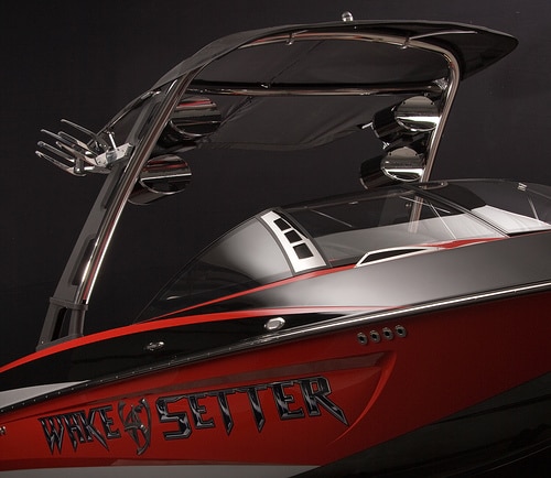 Malibu Boats Illusion Series tower design has advanced many aspects of wakeboard boat towers over the last 7 years to include better forward visibility, unique styling, easier function and greater strength. For 2010 Malibu has added to this list with the new Illusion G3 tower. This new wakeboard tower is standard on all Wakesetter models and features standard Titan Slide-off Spinner Wakeboard Racks, 3” stainless steel tube and billet aluminum construction along with an innovative weightless fold-down feature that folds to standard garage height. Check out this YouTube video: