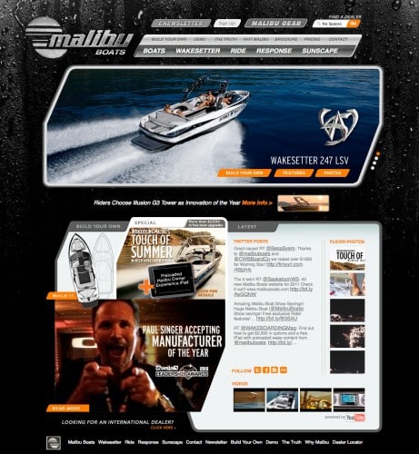 Create your dream Malibu wakeboard boat with Malibu’s iSpec feature, which allows you to choose everything from gelcoat color to options. Next, sign up to demo a 2011 wakeboard boat at your local Malibu Boats dealer, browse through the Malibu Gear store, or download the Malibu Boats App. With Twitter, Flickr and YouTube feeds built into the site, there’s no shortage of new stuff to see at the new malibuboats.com, so check back often.