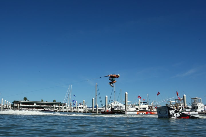 For those who claim that everything’s bigger in Texas, the party surrounding the 2010 Corpus Christi Wakeboard Invitational was proof positive. Temperatures in the 90s and the beautiful Texas coast provided the perfect atmosphere for a party only Texas could throw! The stadium seating at the famous Corpus Christi Marina, along with luxury yachts, fishing boats and endless docks, all provided top-tier seating with amazing views of the action as the Texas Ski Ranch crew rocked the marina along with the some of the best wakeboarders in the country. The only distraction may have been all the pretty Texas girls soaking up the late-spring sunshine.